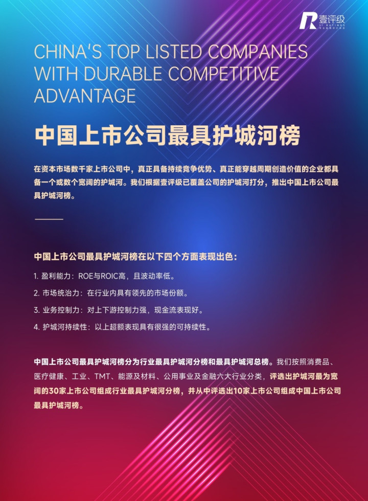 “最具护城河榜”将关注的焦点集中于企业的持续竞争优势。在行业环境变化或者竞争对手发起挑战时,拥有持续竞争优势的企业可以凭借宽阔的护城河抵御市场波动和对手的冲击,保持经营的稳健性和持续性,并获得长期超额回报。